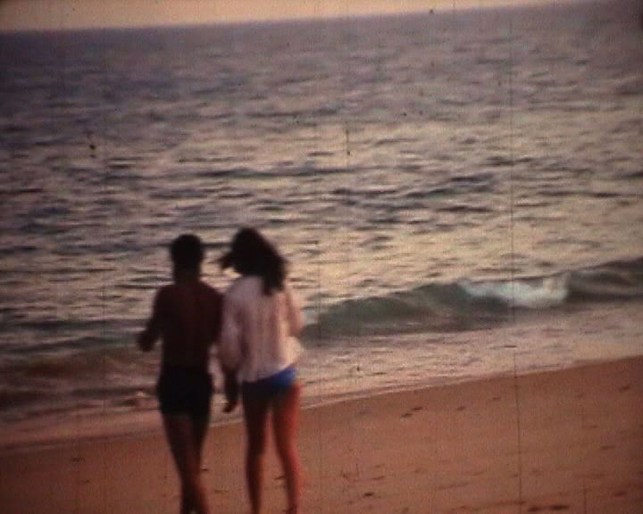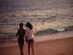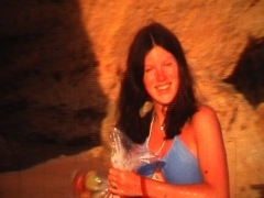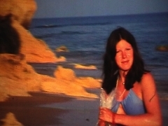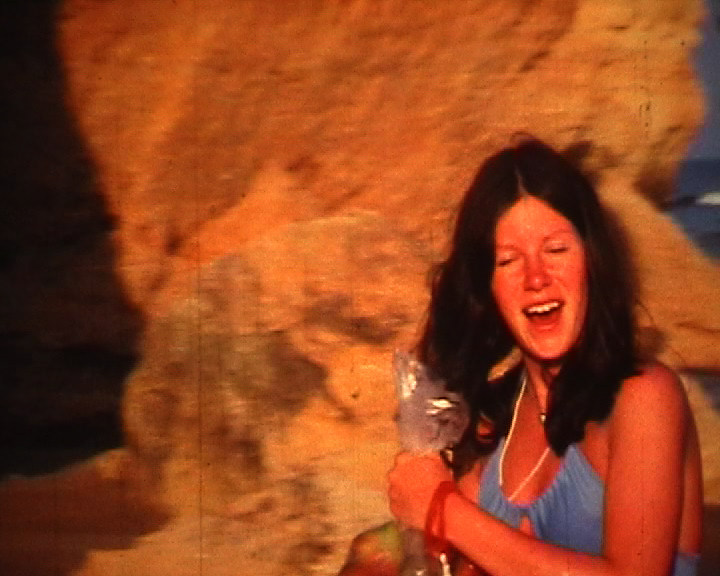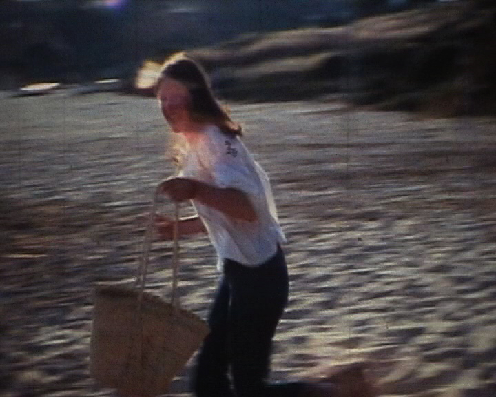 Niki running with her groceries. We were camping on the beach.